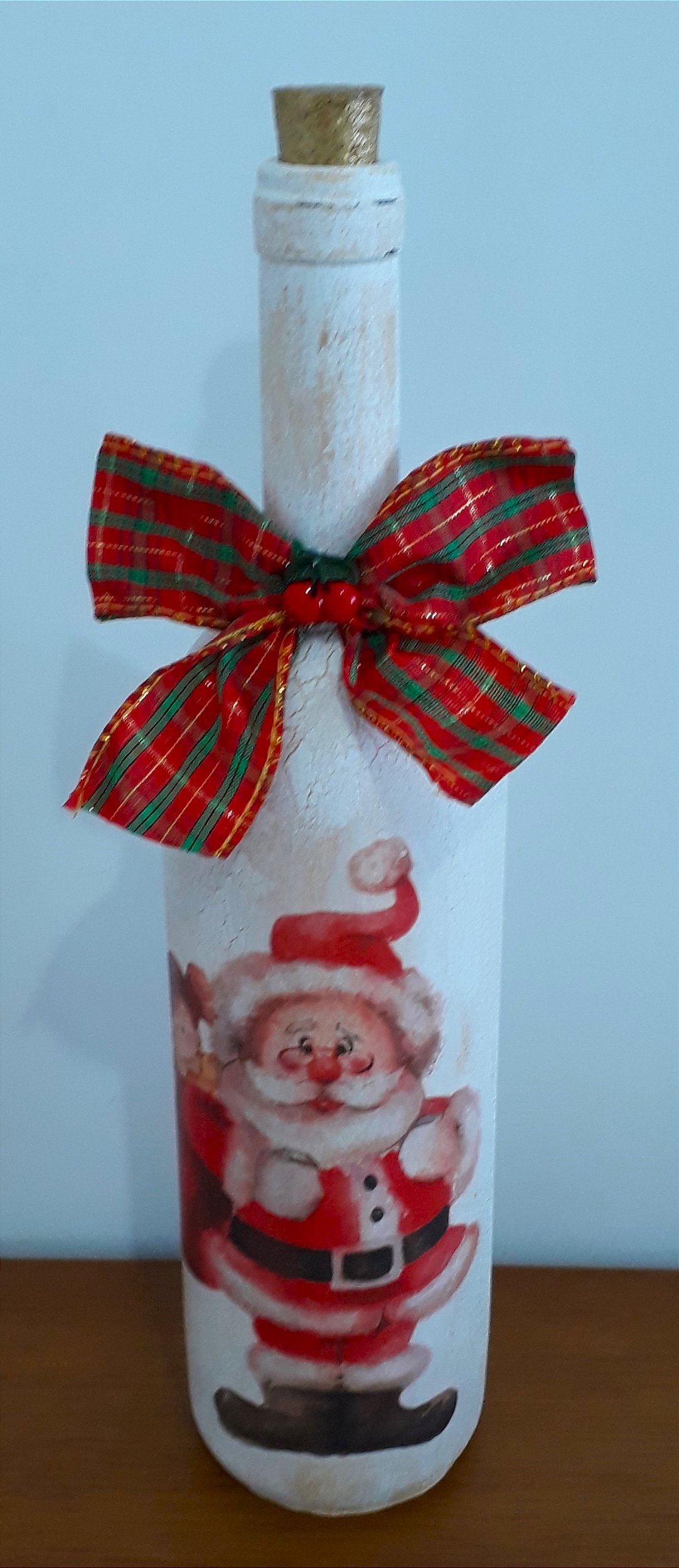 Garrafa Natalina pintada com a técnica craquelê e figura de Papai Noel aplicada.