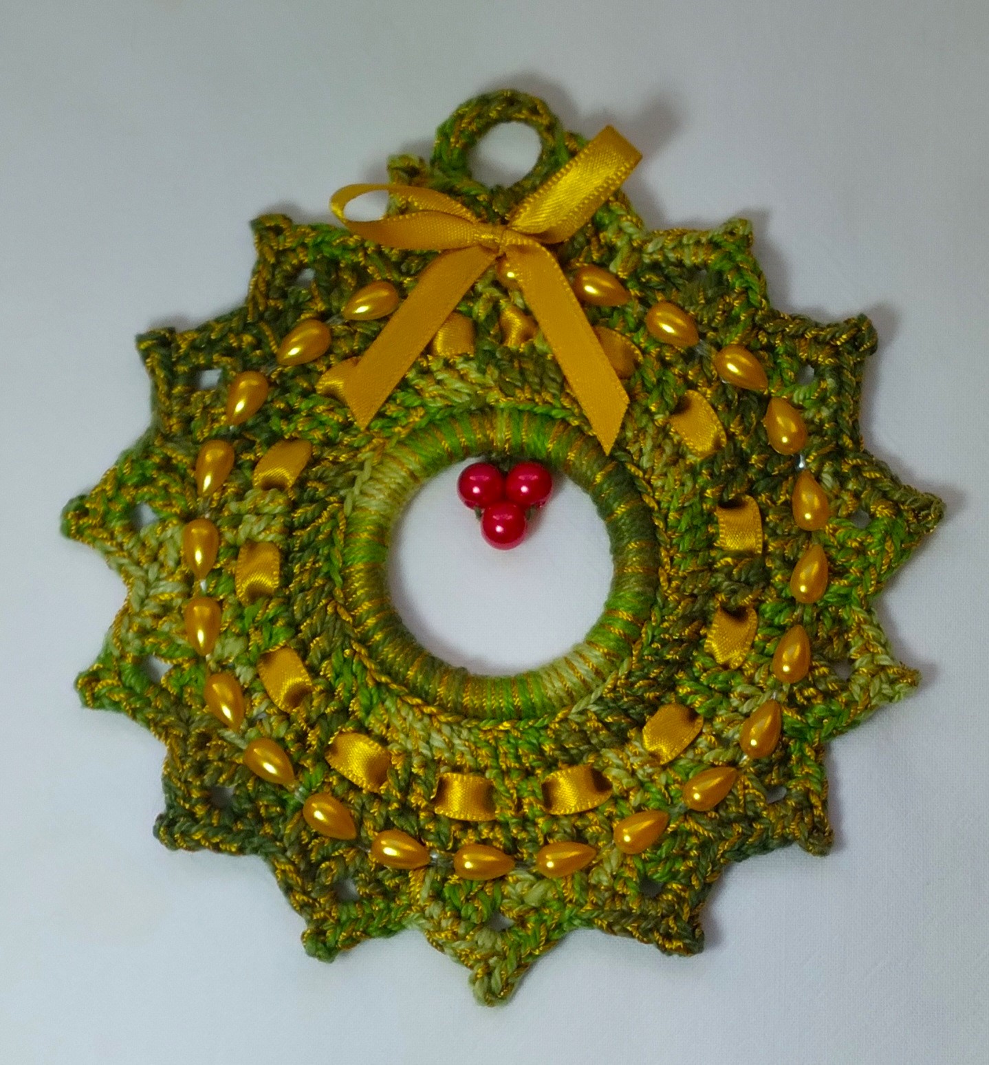Em crochê com linha de algodão e fio sintético dourado.